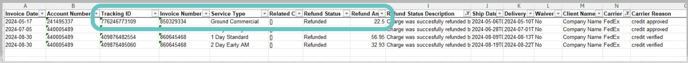 - From the downloaded file, you can see details such as Tracking ID, Invoice number, Refunded Amount and the Status. You can also see the Tracking number from the Audit Recovery Page from the Reveel Platfrom then click on the Audit cards.